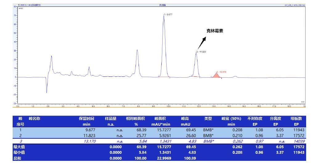 App ID: FLM-T250004 Titank C18 Plus 柱對克林霉素的檢測 色譜柱:Titank C18 Plus 5μ 250*4.6mm(貨號:FMG-0060-EONU) 流速:1 mL/min 檢測:UV210nm 柱溫:40oC 樣品濃度:1 mg/mL 進(jìn)樣量:20 μ 溶劑:N/A 流動相:磷酸二氫鉀溶液(每1mL 中含磷酸二氫鉀6.8mg,用25%的氫氧化鉀溶液調(diào)節(jié) pH 值至7.5)-乙腈(55:45) 色譜圖: