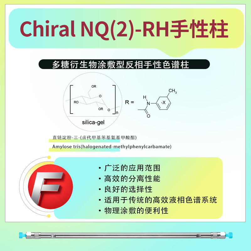 Chiral NQ(2)-RH反相手性柱的固定相為直鏈淀粉-三-(鹵代甲基苯基氨基甲酸酯)(Amylose tris(halogenated-methylphenylcarbamate))。這種固定相的獨特結構使其能夠對手性化合物進行有效的識別和分離。