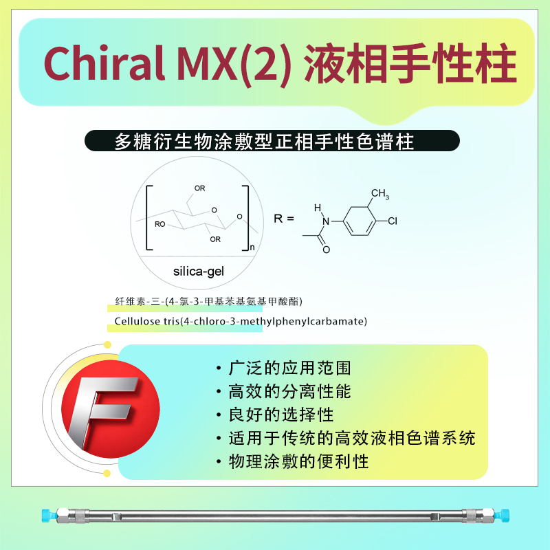 Chiral MX(2)-RH反相手性柱的固定相為纖維素-三-(4-氯-3-甲基苯基氨基甲酸酯)(Cellulose tris(4-chloro-3-methylphenylcarbamate))。這種固定相具有高效的手性識別能力,能夠?qū)Σ煌墓鈱W(xué)異構(gòu)體進行有效的分離。